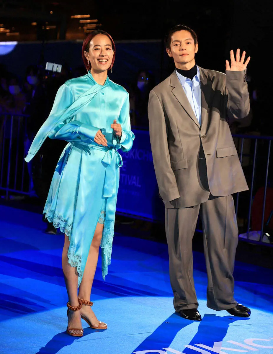<東急歌舞伎町開業前日タワーセレモニー>ブルーカーペットを歩き登場する石橋静河と窪田正孝(撮影・久冨木 修)