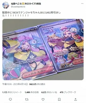 兎田ぺこらのツイッター@usadapekoraから 兎田ぺこら「マジでやらせじゃない!」1BOXでナンジャモSR&SARを神引き … ギャラリーで見る この記事のフォト 2023年04月15日の画像一覧 もっと見る 2023年04月15日の画像をもっと見る
