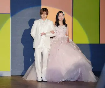 橋本環奈&山田涼介 ピンクドレスとタキシード…“結婚会見”で指輪交換 新ドラマで息ぴったりの夫婦役