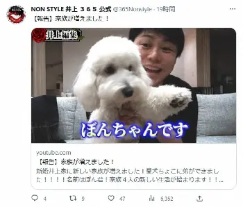 お笑いコンビ「NON STYLE」の井上裕介(43)が15日までに自身のYouTubeチャンネルを更新し「【報告】家族が増えました!」というタイトルで新規動画を投稿した。