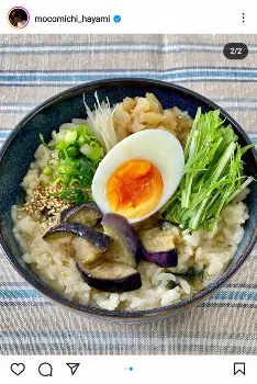 また、「面白いの思いついた」と、ナスのフリーズドライの味噌汁でお粥を作り、卵や水菜、ごま油などをトッピングした中華風にアレンジした一品も披露し「時間に余裕がある時にはこのお粥で!野菜もシャキシャキで美味かった!」とつづっている。