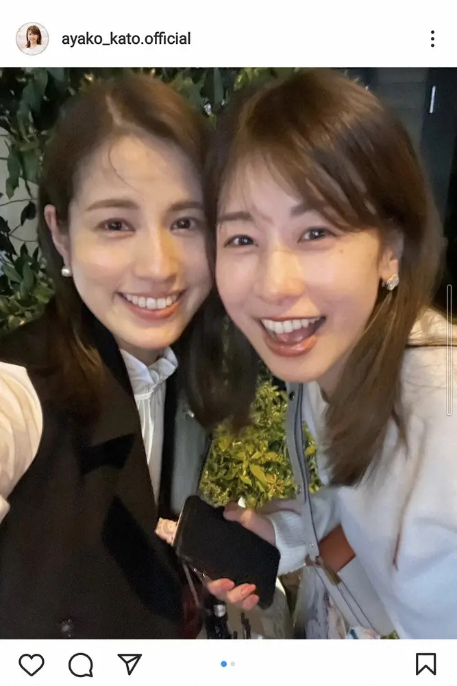 フリーアナウンサーの加藤綾子(37)が16日、自身のインスタグラムを更新。フジテレビの永島優美アナウンサー(31)との2ショットを披露した。