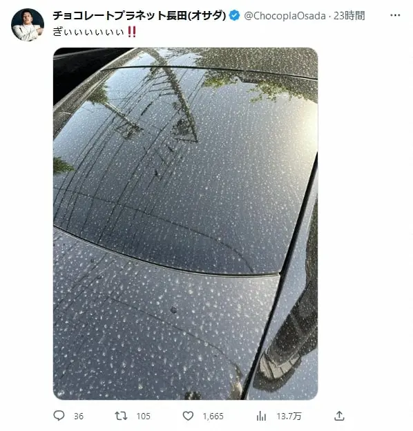 チョコレートプラネットの長田庄平 Photo by スポニチ チョコプラ長田「ぎぃぃぃぃぃぃ!!」と大ショック 愛車が“黄砂&花粉”で… ギャラリーで見る この記事のフォト 2023年04月18日の画像一覧 もっと見る 2023年04月18日の画像をもっと見る