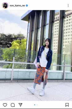 また続く投稿ではグレーとオレンジのロングスカート、グレーのソックス、白のスニーカー、紫のトートバックを合わせた全身ショットも投稿した。