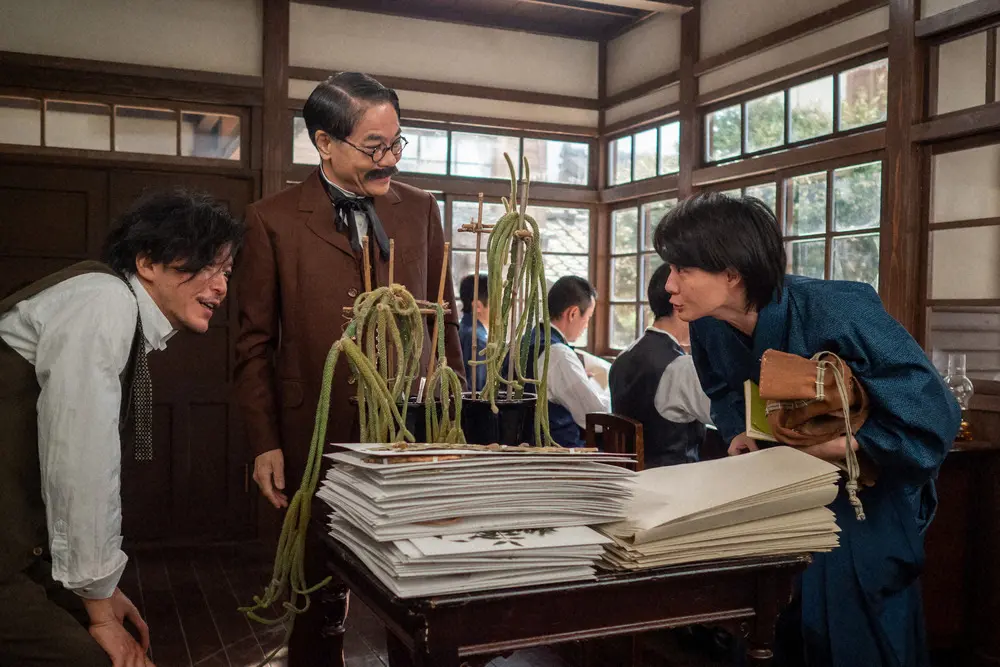 連続テレビ小説「らんまん」第14話。植物学者の野田基善(田辺誠一・左)と里中芳生(いとうせいこう)と話す万太郎(神木隆之介)(C)NHK