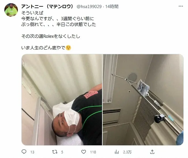 アントニーが無くした超高級腕時計(ツイッター@hsa199029から) アントニー、超高級腕時計を無くし絶望「5~6軒ハシゴして酔っぱらって…」… ギャラリーで見る この記事のフォト 2023年04月22日の画像一覧 もっと見る 2023年04月22日の画像をもっと見る