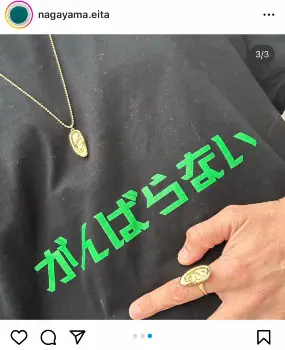 瑛太は「だから、がんばらない」とコメントし、Tシャツにプリントされた「がんばらない」の文字を投稿。指にも耳の形をしたリングを着用した。