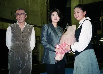 1999年、824回の上演記録した「ラ・マンチャの男」 。2000年に出演する姉の松本紀保(中)から花束を贈られた松たか子と松本幸四郎(当時)