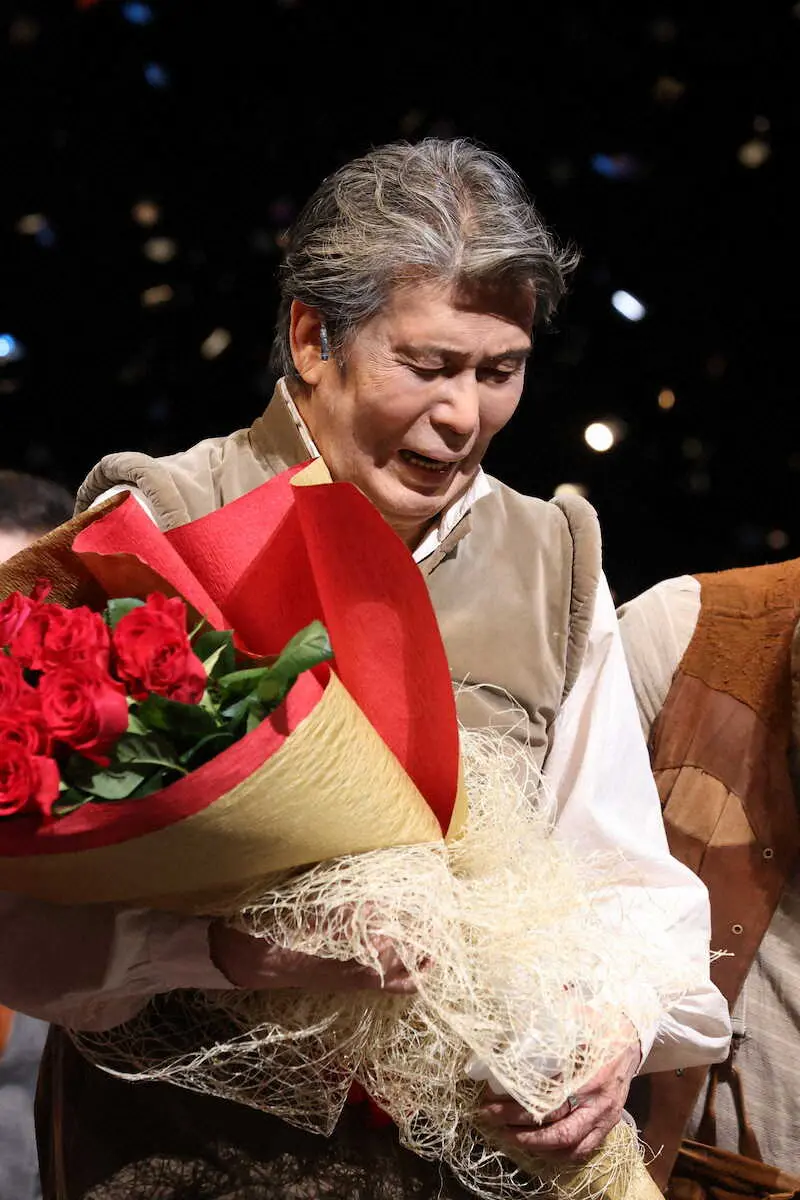 ミュージカル「ラ・マンチャの男」のファイナル公演で千秋楽を迎えた松本白鸚と、花束を渡す松たか子ら共演陣