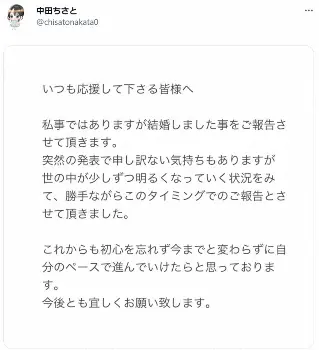 元AKB48の中田ちさと(32)が24日、自身のツイッターで結婚したことを発表した。