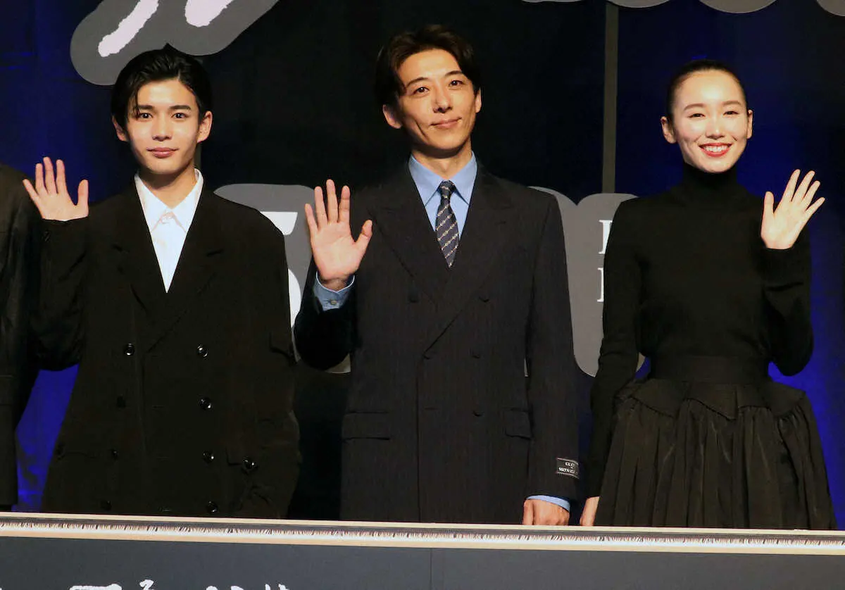 映画「岸辺露伴 ルーヴルへ行く」の完成報告会見を行った(左から)長尾謙杜、高橋一生、飯豊まりえ