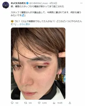 その後、音楽クリエイター集団「CHIMERAZ」のBOSS氏が「朝、優里のスタッフから電話が掛かってきて起こされた スタッフ『優里さんが大量出血して、今病院に運ばれてます、何針も縫うみたいです』 『え?(ジムで格闘技でもしてたんかな?)どこのどいつにやられたんだ?』 スタッフ『いえ、サッカーで、自分から相手に突っ込んでいって自爆してました、、、、1mmも相手悪くないです、、、』 『、、、、。』 あいつサッカー下手すぎやろ #7針」と経緯を説明し、優里の痛々しい傷跡を添付した。