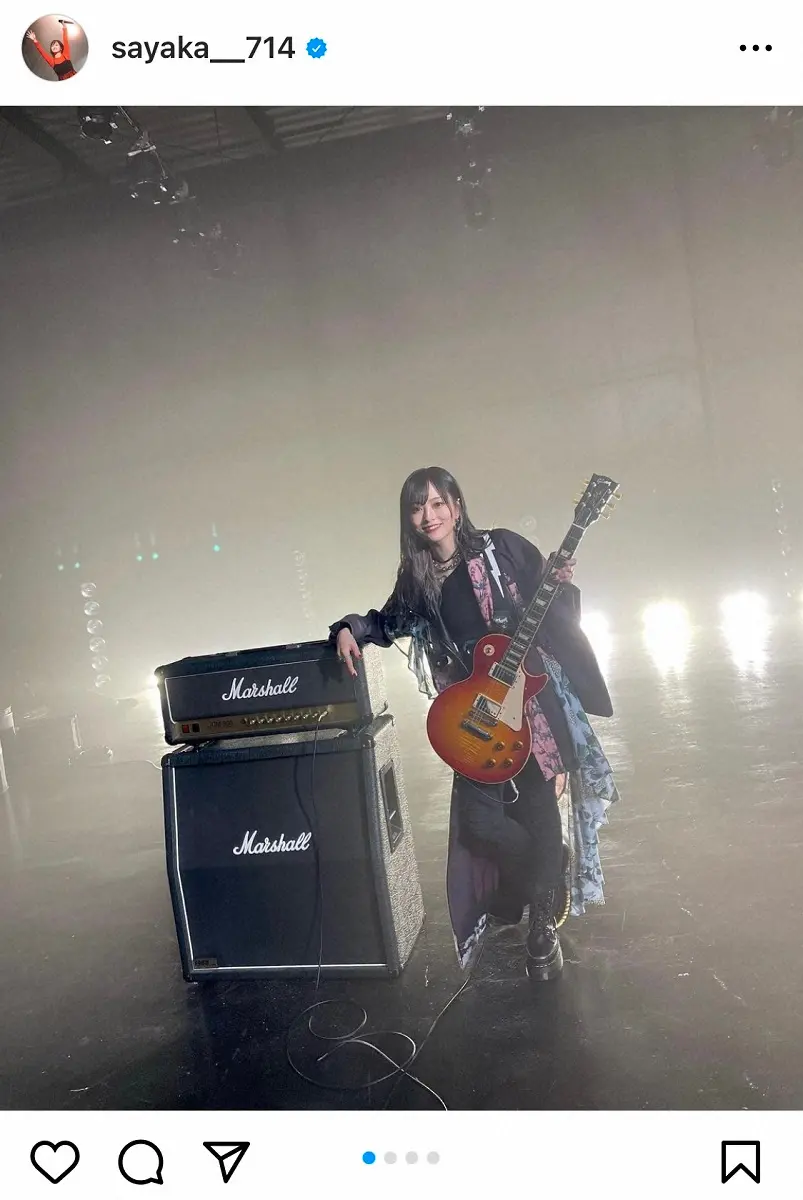 “カッコ良さ全開”の1枚は、レスポールタイプのギターを左手に、全身黒コーデを身にまとってマーシャルのアンプに右手を置いて笑顔。「みんなの自己効力感爆上げにな~れ」とつづり、また別ショットでは、鏡越しに肩が露わになったトップス姿で凛とした表情を見せている。