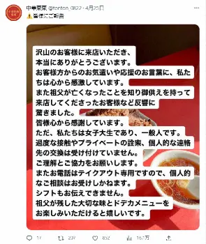 店のツイッターでは「沢山のお客様に来店いただき、本当にありがとうございます。お客様方からのお気遣いや応援のお言葉に、私たちは心から感激しています。また祖父が亡くなったことを知り御供えを持って来店してくださったお客様など反響に驚きました。皆様心から感謝しています」と感謝。続けて「ただ、私たちは女子大生であり、一般人です。過度な接触やプライベートの詮索、個人的な連絡先の交換は受け付けていません。ご理解とご協力をお願いします。またお電話はテイクアウト専用ですので、個人的なご相談はお受けしかねます。シフトもお伝えできません。祖父が残した大切な味とドデカメニューをお楽しみいただけると嬉しいです」と呼びかけた。