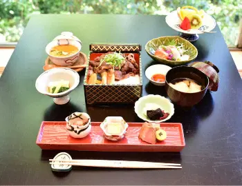 昼食に渡辺明名人は「牛すき煮御膳」、藤井聡太王将はサクラエビを使った「由比桜海老かき揚げ御膳」を注文した。