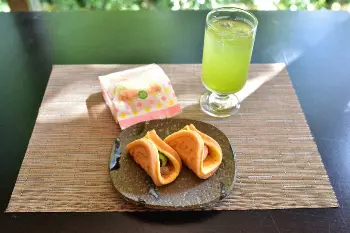 午前10時のおやつは渡辺が、徳川家康の漆黒と金の甲冑(かっちゅう)をきらびやかなソースと金箔(きんぱく)で、徳川四天王のイメージカラーをフルーツで表現した「漆黒の甲冑と徳川四天王のタルト」とアイスコーヒーをオーダーした。藤井は「玄米茶のわらび餅」とアイスコーヒーだった。