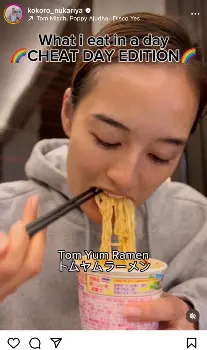 「2ヶ月ぶりのチートデイ!チャージしてまた明日から頑張ろう」と、1日で好きな物をひたすら食べ続ける動画をアップ。トムヤムラーメンに始まり、チョコチップクッキー、チョコパイ、バニラサンドクッキー、カップ焼きそば、モンブラン、ポテチ、ドーナツ4つ、イチゴ大福、チョコバナナ大福、バターサンド、団子、揚げ饅頭2つをペロリ。さらに、生ハムブッラータ、クアトロフォルマッジ、イカスミパスタ、ティラミス、カルボナーララーメンを次々と平らげた。