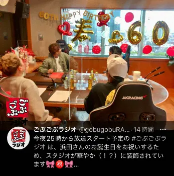 還暦を目前に、ラジオ放送のブース内は装飾が施され、浜田の台本だけが赤色。“ケーキ”も差し出されたが、浜田は「カップケーキやん…」とつぶやき、小さいケーキにさされた60本のろうそくに「数字の6と0買ってきたら2本で済む」とため息をついた。