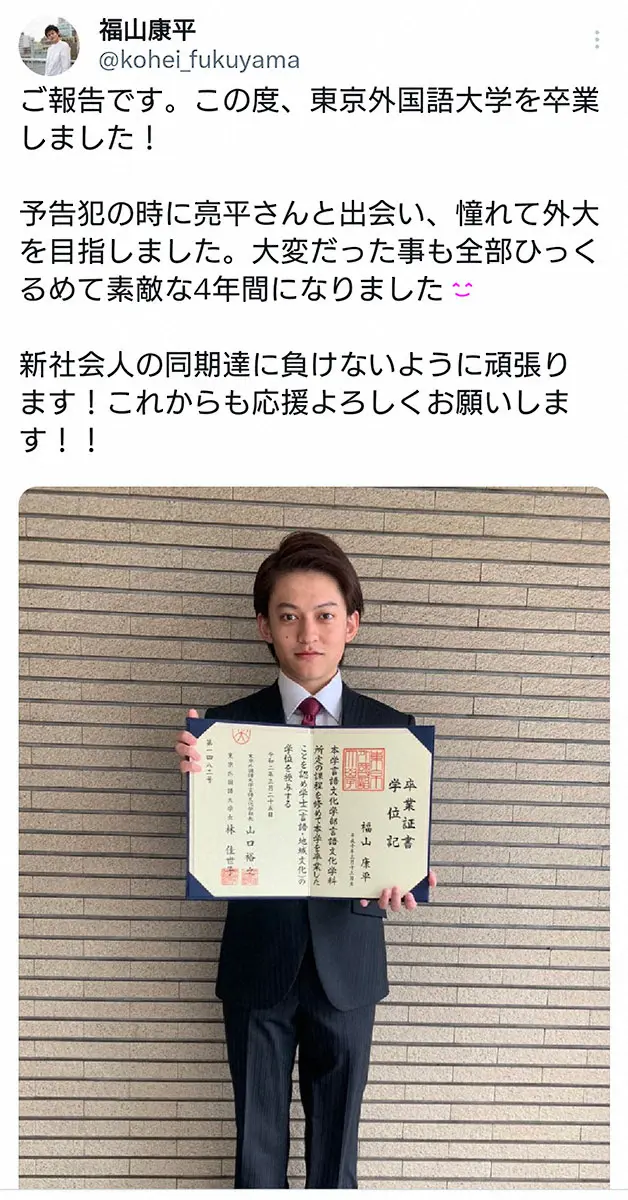 俳優の福山康平(公式ツイッター@kohei_fukuyama)から 福山康平 東京外大に進学したのは憧れ先輩俳優の影響と明かす「かっこい… ギャラリーで見る この記事のフォト 2023年05月09日の画像一覧 もっと見る 2023年05月09日の画像をもっと見る