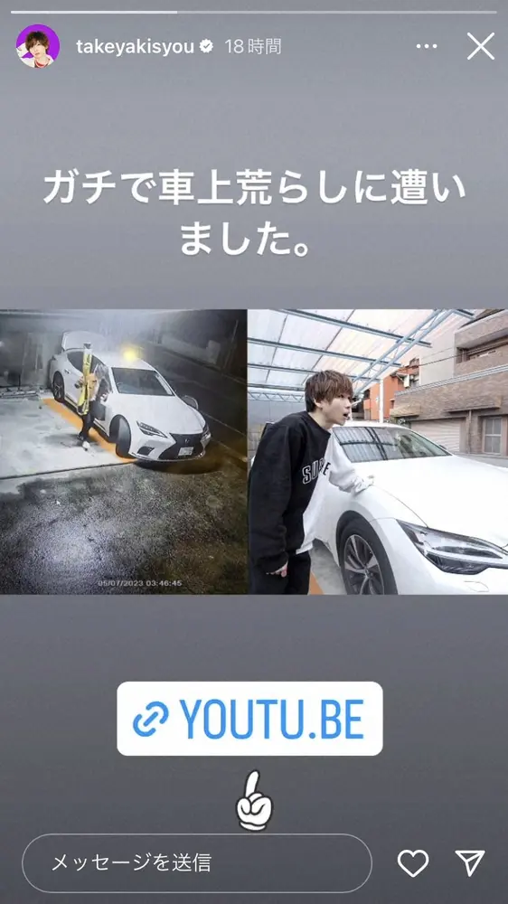 タケヤキ翔の公式インスタグラム(takeyakisyou)から 人気YouTuber、愛車レクサスが“車上荒らし”被害に「キモすぎ…おっさん3人… ギャラリーで見る この記事のフォト 2023年05月11日の画像一覧 もっと見る 2023年05月11日の画像をもっと見る