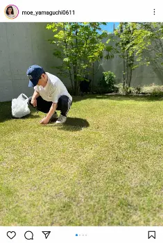 山口は綺麗な芝の庭で帽子をかぶりTシャツ姿の田中の写真を投稿し「夫と雑草抜き 私は飽きたので夫を撮ってる…笑 抜いても抜いてもでてくるね 雑草の生命力見習います」とつづった。