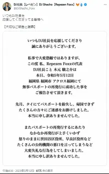 結局、地元・福岡に帰省してようやく再発行。ツイッターでは「大切なご報告と謝罪」として、「いつもDJ社長を応援してくださり誠にありがとうございます。私事で大変恐縮ではありますが、この度 私、Repezen Foxxの代表DJ社長こと木元駿之介は本日、令和5年5月12日 福岡県福岡市アクロス福岡にて無事パスポートの再発行に成功した事をご報告させて頂きます」と文書画像をアップした。