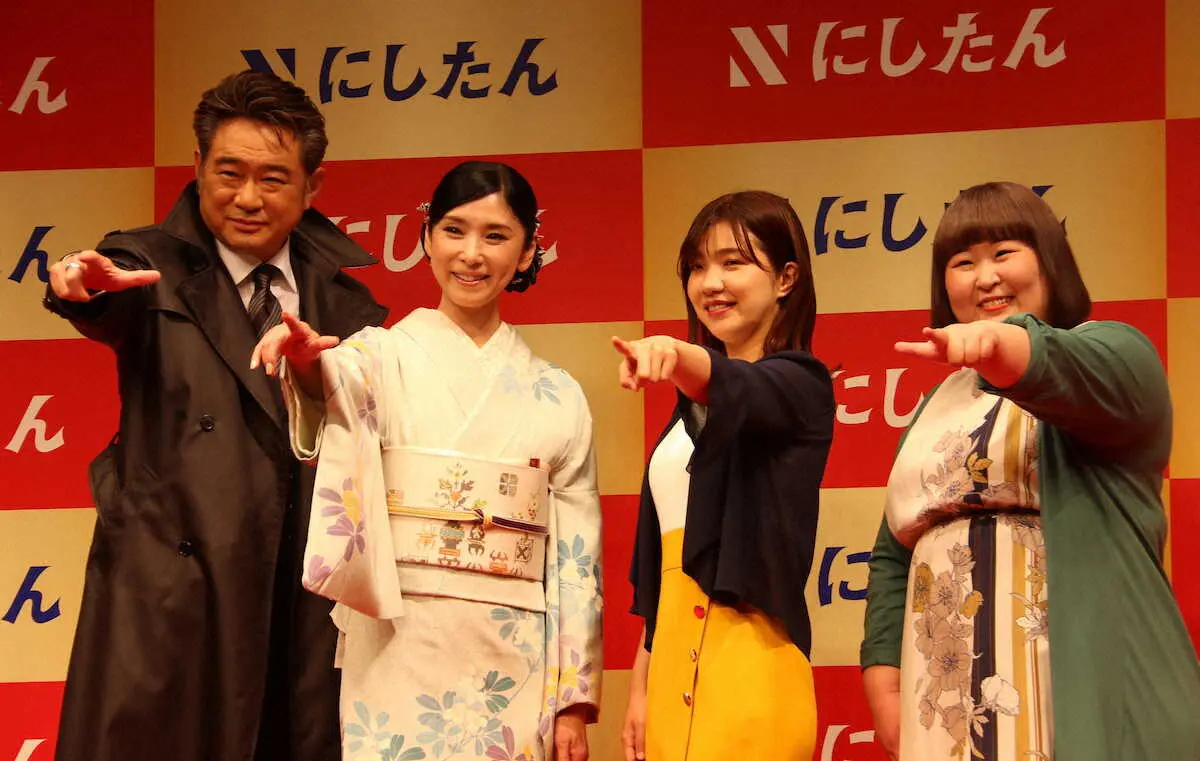 ポーズを決める(左から)船越英一郎、黒木瞳、福田麻貴、かなで(撮影・前田 拓磨)
