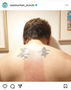 鈴木氏は「湿布貼ってたとこが赤くただれてしまった。転んだときに首と背中をやってしまい。何日か貼ってたら、こんなことに」といい1枚の画像を添付。そこには、肩の部分に「美幸」という文字がタトゥーで彫られている姿が映っていた。