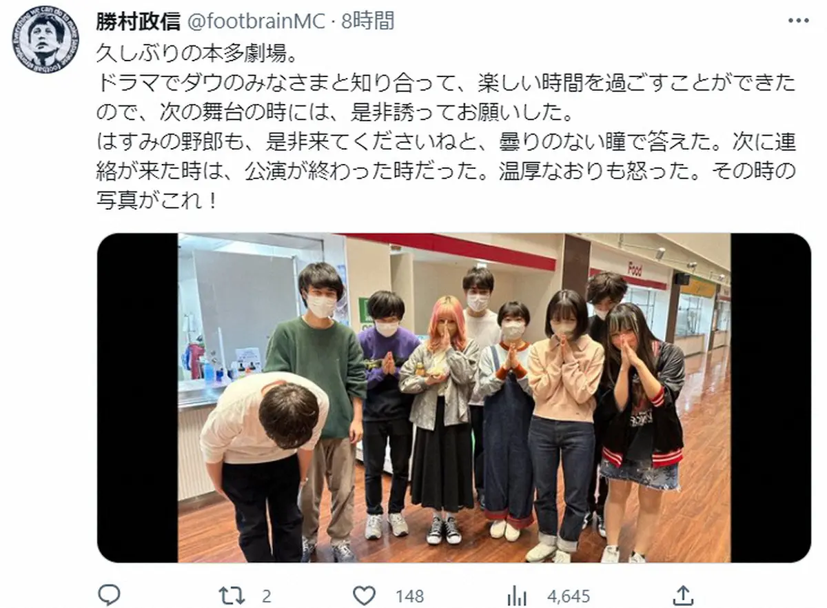 勝村政信ツイッター(@footbrainMC)から 勝村政信「ちゃんと謝れ」お笑い集団に怒り? 「全員爆笑で」頭下げた8人… ギャラリーで見る この記事のフォト 2023年05月18日の画像一覧 もっと見る 2023年05月18日の画像をもっと見る