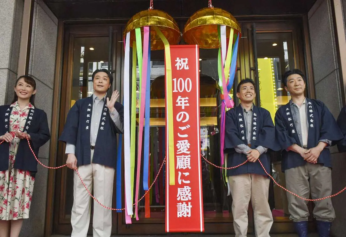 公演中の松竹新喜劇の藤山扇治郎らがくす玉を割ると、開場を待つ人々から拍手が起こった。市村昌也総支配人が「これからも皆さまに喜ばれるお芝居をご覧いただける劇場でありたい」とあいさつ。扇治郎らが「芝居町道頓堀の伝統を令和に引き継ぎ100周年」などと口上を述べ、来場を呼びかけた。