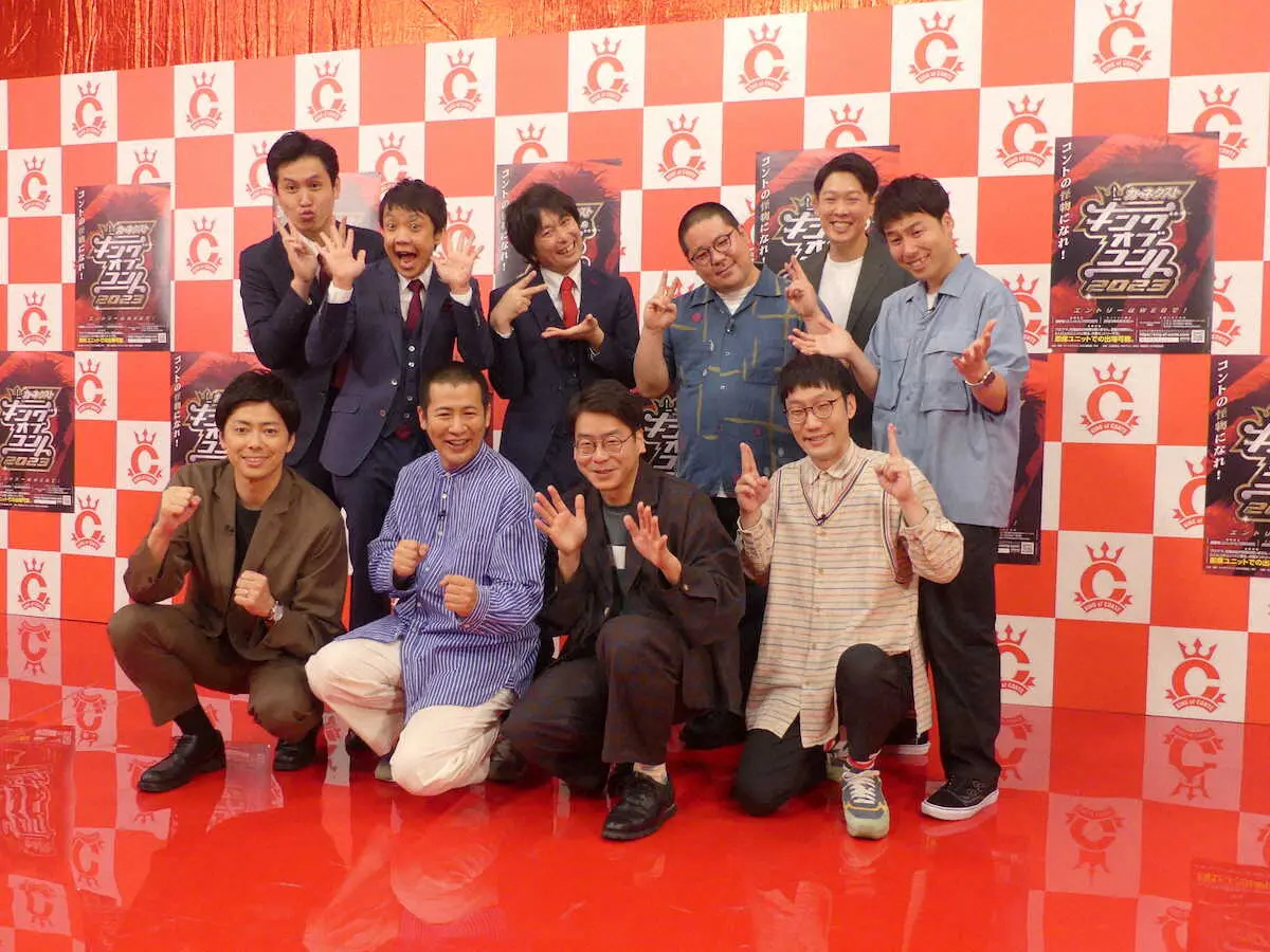 「キングオブコント2023」の会見を行った(前列左から)コットンの西村真二、きょん、男性ブランコの浦井のりひろ、平井まさあき、(後列左から)や団のロングサイズ伊藤、本間キッド、中嶋亨、ネルソンズの和田まんじゅう、青山フォール勝ち、岸健之助
