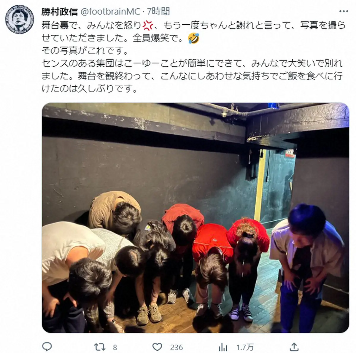 そして「舞台裏で、みんなを怒り、もう一度ちゃんと謝れと言って、写真を撮らせていただきました。全員爆笑で。その写真がこれです」と、、メンバー8人が頭を下げた写真を公開。「センスのある集団はこーゆーことが簡単にできて、みんなで大笑いで別れました。舞台を観終わって、こんなにしあわせな気持ちでご飯を食べに行けたのは久しぶりです」と、ダウ90000との楽しいひと時を伝えた。