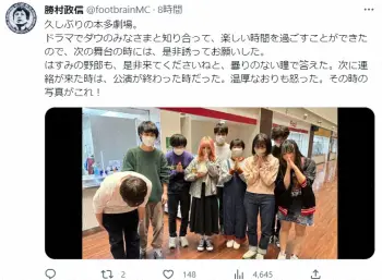 勝村は「今日はダウ90000の舞台を観て来ました。ドラマでもお世話になったので、ちゃんと舞台を観に行かないとと思っていて、ようやく願いが叶いました」と報告し「とにかく素晴らしい」と絶賛した。