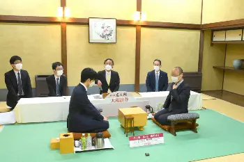 渡辺明名人(39)が挑戦者に藤井聡太王将(20)=竜王、王位、叡王、棋王、棋聖を含む6冠=を迎える第81期名人戦(毎日新聞社、朝日新聞社主催)7番勝負第4局は21、22日、福岡県飯塚市の麻生大浦荘で指される。20日は対局場検分の後、前夜祭があり、地元ファンと交歓した。ここまでの対戦成績は藤井の2勝1敗。先手は藤井で、藤井が勝てば最年少名人と7冠に王手がかかり、4連覇を期す渡辺は勝てばタイに戻る。