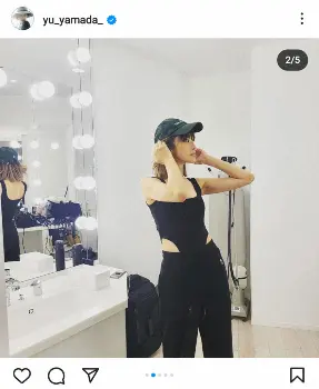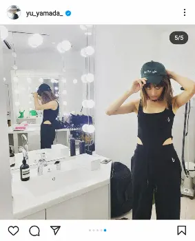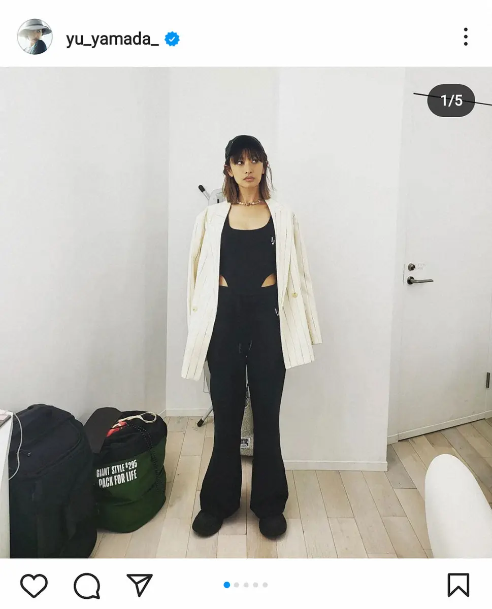 山田は「とあるひの私服」とし、「お気に入りの」腰骨がパックリ見える黒のタンクトップにスウェット、白ベースのストライプのビッグジャケットをはおった姿を投稿し「腰骨が見えて、カジュアルなのにSEXY たまらないカットです」と説明した。さらに「blackpinkの練習着的な」と付け加えた。
