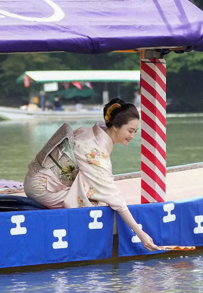 女優の観月ありさ(46)が参加し、御座船から川面に扇を浮かべる「扇流し」を披露。多くの観光客が見入った。観月は「とても奇麗なお祭り。これから何百年と続いてほしい」と話した。