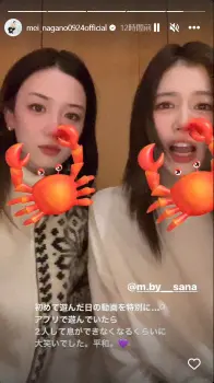 さらに、永野は「初めて遊んだ日の動画を特別に…」と、2人で撮影したプライベートの動画をアップ。「アプリで遊んでいたら2人して息ができなくなるくらいに大笑いでした。平和」とつづった。対するサナも「初めて遊んだ日にこれ出来るんだもんね 仲良くなる以外なかった」とコメントした。