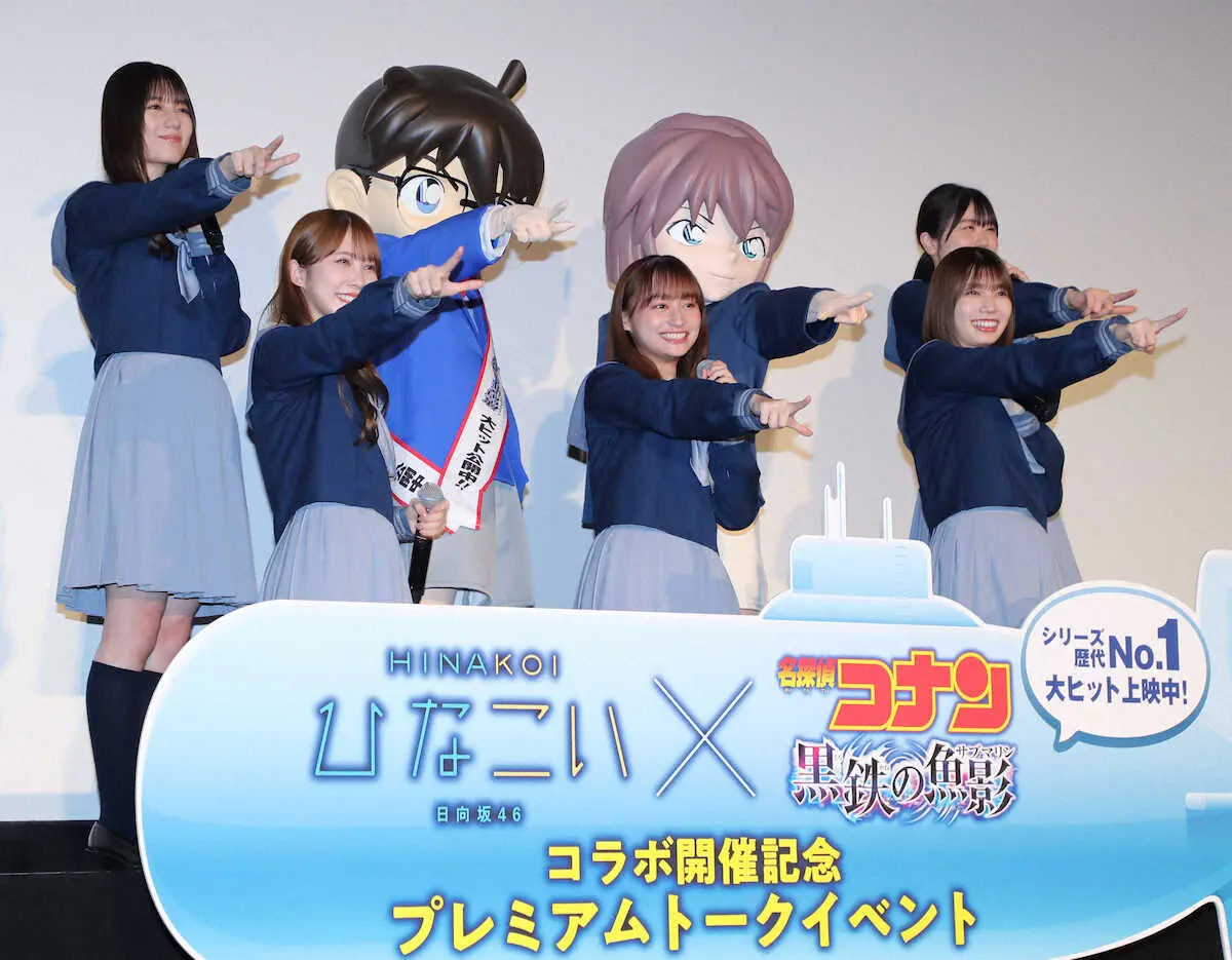 <「ひなこい」コラボ開催記念「名探偵コナン 黒鉄の魚影」プレミアムトークイベント>トークイベントに登壇した(前列左から)日向坂46の加藤史帆、影山優佳、高本彩花(後列同)小坂菜緒、江戸川コナン、灰原哀、丹生明里(撮影・大城 有生希)