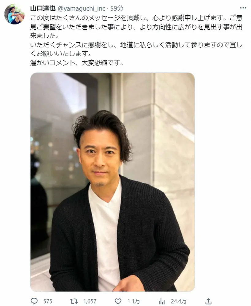 「TOKIO」元メンバー・山口達也さん(51)が23日に自身のツイッターを更新。そこでつづったメッセージに大きな反響があった。