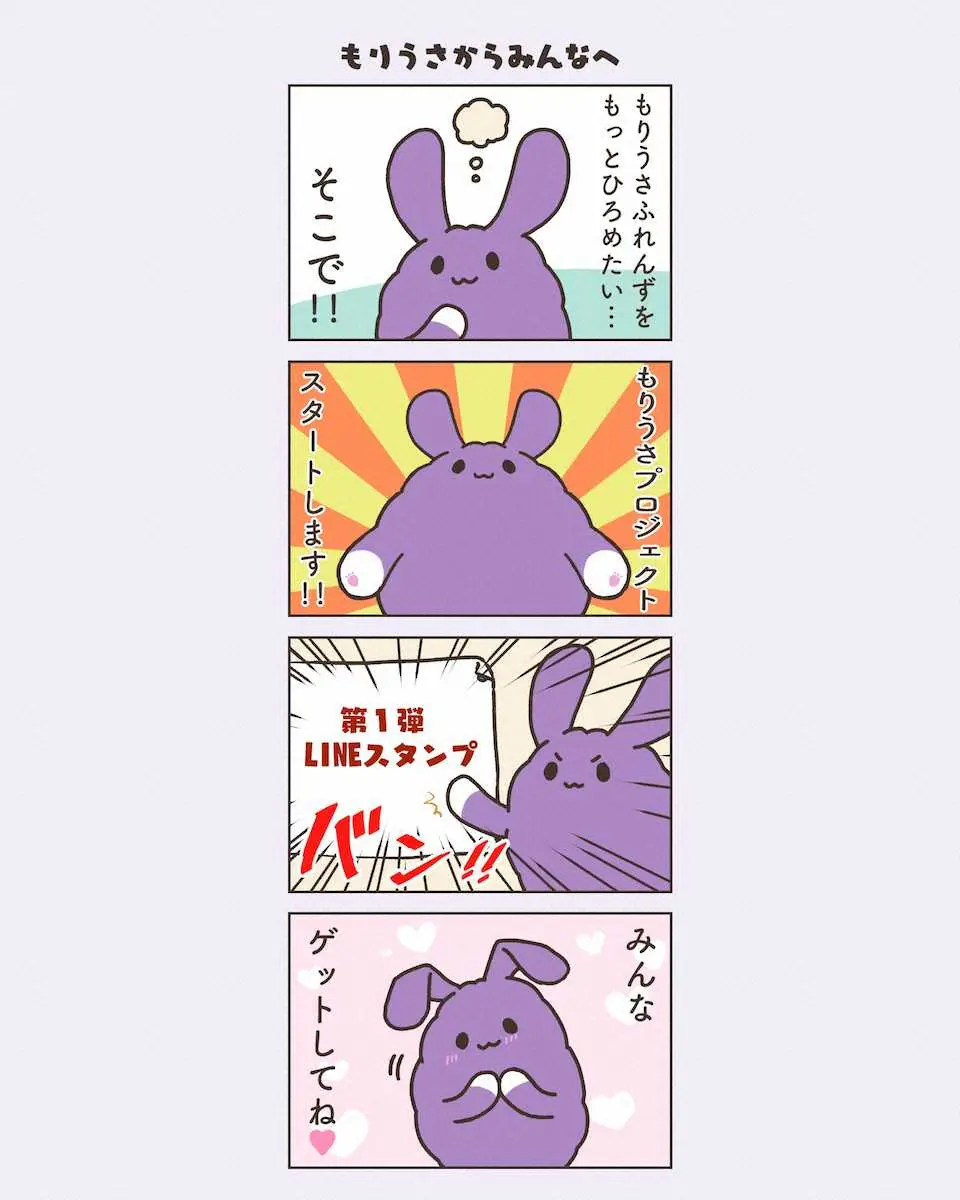 「もりうさのLINEスタンプができました!!!! みんなゲットしてくれよなあああ!!!!」とコメントして、全24種類のスタンプ画像と、「もりうさからみんなへ」と題した四コマ漫画の画像を公開。その漫画では、もりうさが