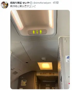 せいやは「飛行機に男女漫才コンビ」とつづり、写真を投稿。写真には、機内のトイレマークが表示されているが、せいやはトイレの表示を「センターマイク」に見立てたようだ。
