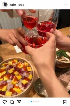 そして「最近頂いた土鍋、お気に入りなんです~ピンクの飲み物は美酢(ミチョ)」と補足の情報も記し「子供たちはハンバーグとちらし寿司一緒に食べていましたよ」と家族4人での乾杯ショットも添えた。