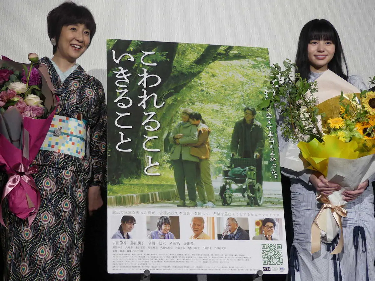 吉田は「介護の勉強をしてから撮影に入りました。テーマは重いけれど、背中を押してくれる作品になっています」とアピール。遙の高校の恩師で若年性認知症を患う小田由美子を演じた藤田朋子(57)も劇場に駆けつけ、「(認知症を)インターネットで調べたり、ドキュメンタリーを拝見したりして現場に臨みました。私の父も認知症でしたので、演じるに当たって実体験が出てるかな」と役作りの一端を披露した。