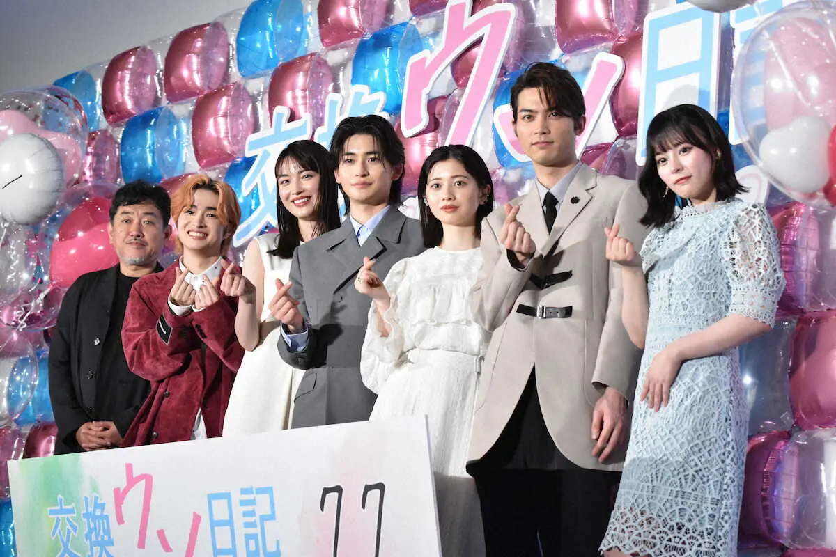映画「交換ウソ日記」完成披露試写会に出席した(左から)竹村謙太郎監督、曽田陵介、茅島みずき、高橋文哉、桜田ひより、板垣瑞生、齊藤なぎさ