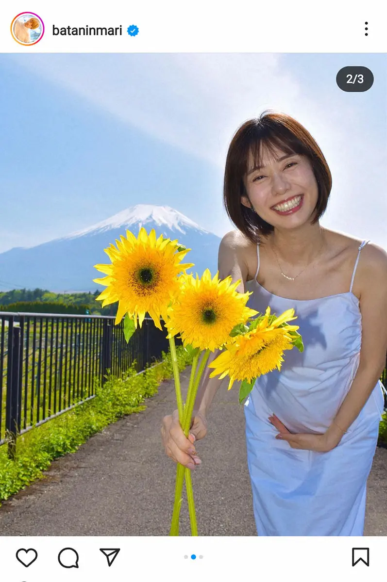 おばたは富士山をバックに白いキャミソールドレス姿でひまわりを持って笑顔の山崎アナの写真などを投稿し「富士山の近くで妻を撮りました!我ながらなかなかうまく撮れたよ!」と報告。「1枚目はまるでビダルサスーン」とも自己解説した。