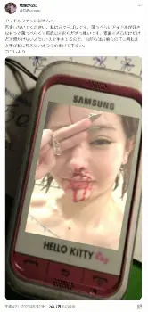 続けて「素直すぎるだけだけど迷惑かけないように1人で生きてるので、お前らはお前らの打つ汚ねえ文字が私に見えないように心掛けて下さい。ヨゴレより」と記し、流血した自身が写る携帯電話を撮影した刺激的な写真を添付している。