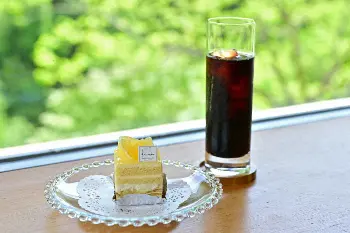 午後のおやつは渡辺名人が「レモンのオペラ」(爽やかな酸味のあるレモンケーキ)とアイスコーヒー、藤井王将が「レモンのオペラ」(爽やかな酸味のあるレモンケーキ)と「林農園しぼったままのぶどうジュース」(ナイアガラ白)。
