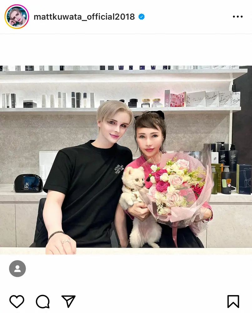 Mattの知人でエステサロンやコスメをプロデュースしている梅田英姫さんが入院し、退院したことを報告。「退院おめでとう御座います やっと会えて嬉しかったですしお礼に頂いたLVのニットTシャツ着てきました 素敵なプレゼントありがとうございます」と2ショットをアップした。