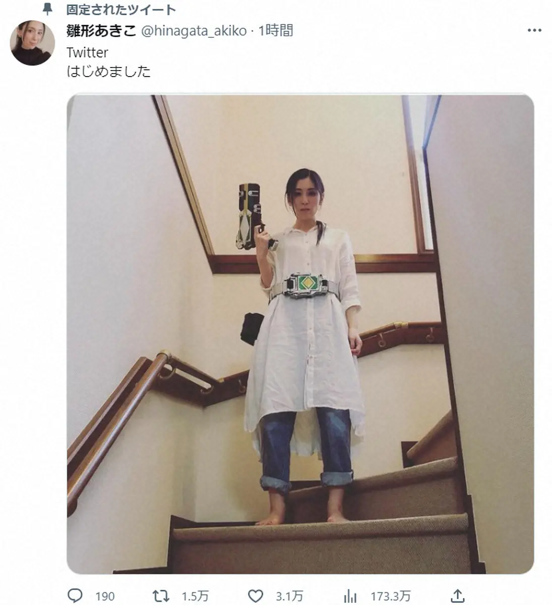 さらに、雛形は「Twitterはじめました」とつづり、夫・天野が演じた仮面ライダーギャレンの変身装備を身につけた写真を投稿し、1万5千件以上リツイートされるなど話題に。その他、プロフィル欄では「天野浩成の奥さんです」とコメントし、天野もプロフィル欄で雛形のインスタグラムリンクを紹介。同時刻に2人で時報を投稿するなど、おしどり夫婦ならではのSNSを公開した。