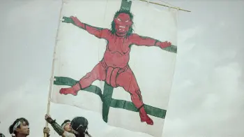 鳥居強右衛門が磔にされた姿を描いたとされる旗指物「落合左平次道次背旗(おちあいさへいじみちつぐせばた)」や絵図「鳥居勝商磔殺之図(とりいかつあきたくさつのず)」が有名。今作は逸話に沿い、凄まじい散り際が描かれた。
